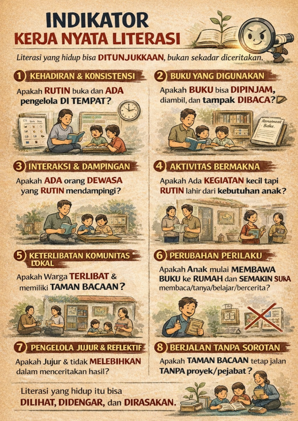 - Kejujuran dan refleksi pengelola. Kerja nyata literasi selalu disertai kesadaran keterbatasan. Apakah pengelola berani mengakui kekurangan? tidak melebih-lebihkan capaian? Mau belajar dan menyesuaikan? Tanda bahaya bila semua info dan laporan selalu “sukses”, tidak ada cerita gagal, dan akhirnya lebih banyak foto dan medsos daripada proses. Biar bagaimana pun, literasi yang jujur “lebih esensi” daripada literasi pencitraan.